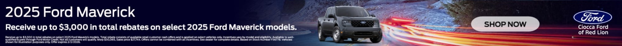 Find Your Perfect 2024 or 2025 Ford at Ciocca Ford Western Division Looking for your next Ford? Ciocca Ford Western Division offers an extensive inventory of brand-new 2024 and 2025 Ford models, with two convenient locations in Red Lion and York, Pennsylvania. We make it easy to get behind the wheel of your ideal vehicle, whether youâre interested in a rugged truck, a versatile SUV, or a high-performance car. Our lineup includes the tough and reliable Ford F-150, Ford Super Duty (F-250, F-350), Ford Ranger, and adventurous Ford Bronco. If you're in need of a spacious, family-friendly SUV, check out the Ford Explorer, Ford Expedition, Ford Edge, and Ford Escape. For those who crave performance, the iconic Ford Mustang delivers style and speed. Looking ahead, the 2025 Ford models include the F-150, Super Duty (F-250, F-350), Ranger, Bronco, Explorer, Expedition, Edge, Escape, and Mustang, each designed to offer the latest in Ford innovation, technology, and performance. At Ciocca Ford Western Division, we offer competitive pricing, flexible financing options, and exceptional customer service to make your car-buying experience as smooth as possible. Whether youâre in Red Lion, York, or the surrounding areas, visit us today and drive home in the Ford that fits your lifestyle. Shop Now and Experience the Ciocca Difference. Your new Ford is waiting! 4K Tow Package (Trailer Brake Controller, Trailer Hitch (Class III) 2" Receiver, Transmission Oil Cooler, and Upgraded Cooling Fan), Equipment Group 101A, Ford Co-Pilot360 1.0 (Auto High Beams, BLIS w/Cross-Traffic Alert, Cross Traffic Brake Assist, Evasive Steering Assist, Intersection Assist, Lane-Keeping System, Power Glass Manual-Folding Mirrors, Pre-Collision Assist w/Automatic Emergency Braking, Rear Parking Sensors, and Rear-View Camera), Maverick XL, 2.5L I-4 Hybrid, AWD, Oxford White, Black Onyx/Dark Slate Cloth, 2.91 Axle Ratio, 4-Wheel Disc Brakes, 6 Speakers, ABS brakes, Air Conditioning, AM/FM radio: SiriusXM with 360L, Apple CarPlay/Android Auto, Auto High-beam Headlights, Automatic temperature control, Brake assist, Bumpers: body-color, Compass, Delay-off headlights, Driver door bin, Driver vanity mirror, Dual front impact airbags, Dual front side impact airbags, Electronic Stability Control, Emergency communication system: SYNC 4 911 Assist, Exterior Parking Camera Rear, Four wheel independent suspension, Front anti-roll bar, Front Bucket Seats, Front Center Armrest, Front Cloth Bucket Seats, Front reading lights, Fully automatic headlights, Illuminated entry, Internet access capable: FordPass Connect 5G, Knee airbag, Low tire pressure warning, Occupant sensing airbag, Outside temperature display, Overhead airbag, Overhead console, Panic alarm, Passenger door bin, Passenger vanity mirror, Power steering, Power windows, Radio data system, Radio: AM/FM Stereo w/6 Speakers, Rear anti-roll bar, Rear step bumper, Remote keyless entry, SiriusXM w/360L, Speed control, Speed-sensing steering, Steering wheel mounted audio controls, SYNC 4 w/Enhanced Voice Recognition, Telescoping steering wheel, Tilt steering wheel, Traction control, Trip computer, and Wheels: 17" Steel w/Sparkle Silver Painted Cover. Price includes the following incentives:$1000 - Retail Customer Cash. Exp. 03/31/2026
